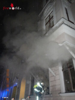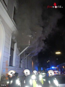 Aus drei straßenseitigen Fenstern drang dichter Brandrauch. Zwei Personen, welche sich zuvor noch in der Wohnung aufgehalten hatten, konnten selbst aus der Wohnung flüchten. Die Feuerwehrleute stiegen unter Atemschutz über eine Leiter in die Wohnung ein und begannen den Brand zu bekämpfen. Weitere Einsatzkräfte nahmen eine Löschleitung durch das Stiegenhaus vor. Parallel dazu wurde eine Person aus der direkt über dem Brand gelegenen, verrauchten Wohnung gerettet.
