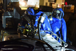Und dort hatten sie sofort mit einer weiteren Schwierigkeit zu kämpfen: Die Fahrertüre ließ sich mit der Bergeschere nicht öffnen, da die Kabine älterer Bauart und durch den Kranarm völlig deformiert war. Erst mit einer zweiten, größeren Schere konnte der eingeklemmte Fahrer befreit werden. Nachdem die Fahrzeuginsassen versorgt waren, wartete das nächste Problem: Unbekanntes flüssiges Gefahrgut lief aus einem Tank aus – es drohte höchste Brand- und Umweltgefahr. Denn die Flüssigkeit hätte sich entzünden und auch in den naheliegenden Leh-Bach laufen können.