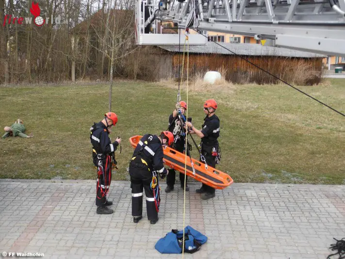 WAIDHOFEN/THAYA (NÖ): Regelmäßig üben die Mitglieder der Höhenrettungsgruppe ihre Fertigkeiten. Nur so können sie im Einsatzfall rasch und sicher die Einsatzkräfte unterstützen oder auch Menschenrettungen aus Höhen und Tiefen durchführen. Dieses Mal wurde mit der Drehleiter geübt.