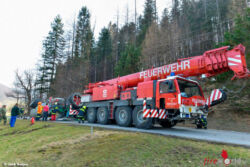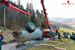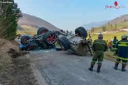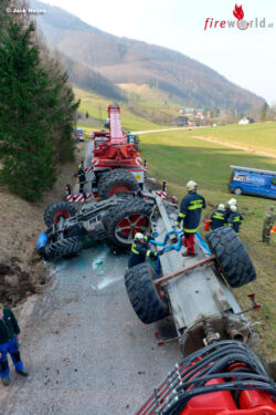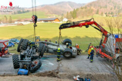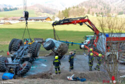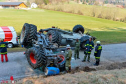 Oö: Bergung eines mit Rädern nach oben liegenden Traktor-Güllefass-Gespanns in Molln