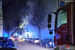 Auf einigen Balkonen im 1. und 2. Obergeschoß befanden sich Personen, die ihre Wohnung nicht über den Treppenraum verlassen konnten. Zeitgleich wurde ein Trupp unter Atemschutz mit einem C-Rohr zur Brandbekämpfung und ein Trupp unter Atemschutz zur Kontrolle des Treppenraumes eingesetzt. Durch die Besatzung der Drehleiter wurden vier Personen von den Balkonen gerettet. Zwei gebehinderte Personen konnten auf ihrem Balkon verbleiben und wurden durch einen Feuerwehrmann betreut.