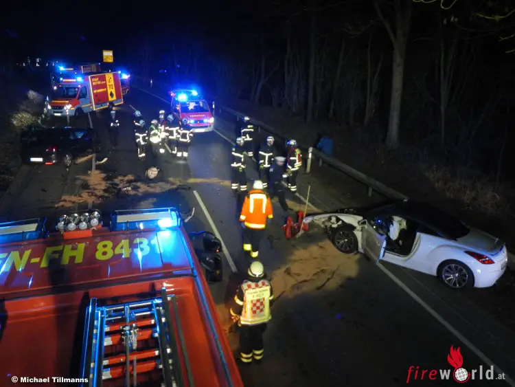 HERDECKE (DEUTSCHLAND): Gegen 21:16 Uhr wurden am 25. März 2015 auf der Ender Talstraße bei einem Verkehrsunfall zwei Personen verletzt. Der Freiwilligen Feuerwehr Herdecke wurde zunächst gemeldet, sie seien nach einem Frontalzusammenstoß in ihren Fahrzeugen eingeklemmt.