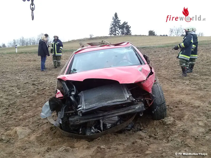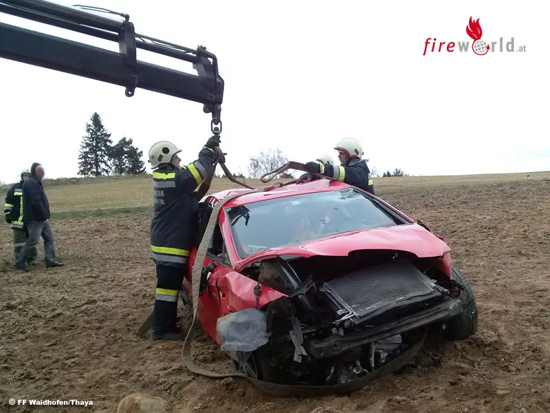Anschließend überschlug sich der Pkw und kam schwer beschädigt im Acker zum Stillstand. Der Lenker hatte Glück und konnte unverletzt den Unfallwagen verlassen. Der schwer beschädigte Seat Leon wurde mit dem Kran auf das Lastfahrzeug verladen und zum Feuerwehrhaus nach Waidhofen/Thaya abtransportiert. Um 16.06 Uhr konnten die Einsatzkräfte den Einsatz beenden und wieder ins Feuerwehrhaus einrücken.