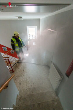Das zweite Beispiel war ähnlich, hatte jedoch den Unterschied, dass die Überdruckbelüftung bereits im Vorfeld gestartet worden ist, um ein als verraucht angenommenes Treppenhaus erst einmal rauchfrei zu machen und gefahrlose Evakuierungsmaßnahmen zu ermöglichen. Erst dann wurde die Brandbekämpfung bzw. Vorgehensweise wie im vorangehenden Beispiel fortgesetzt.