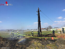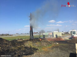 Eine Wiese mitsamt einem Grünschnitthaufen war in Brand geraten. Durch den starken Wind begünstigt breitete sich das Feuer schnell aus. Während dem Aufbau der Schlauchleitungen begann ein am Acker postierter 20kV Kabelabspannmast zu brennen. Bei Beginn der Löscharbeiten stand der Masten bereits in Vollbrand.