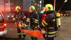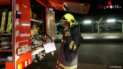 Der Brand wurde durch eine Nebelmaschine und pyrotechnischen Hilfsmittel simuliert. Zwei Atemschutztrupps der beiden Feuerwehren machten sich auf die Suche nach der eingeklemmten Person und dem Brandherd. Außen wurden gleichzeitig Löschleitungen für die Drehleiter und zur Wasserversorgung der Tanklöschfahrzeuge aufgebaut. Nach kurzer Zeit konnte die Person gerettet und „Brand aus“ gegeben werden.