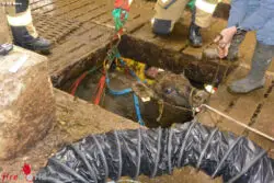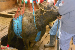 Es wurde somit beschlossen, in einer ersten Aktion die Grube mit einem Hochleistungsventilator zu belüften und anschließend im Dach des Bauernhauses eine Rettungsöffnung für den Einsatz des Krans anzubringen. In einer zweiten Aktion konnten die Tiere mittels Horizontalnetz aus der Jauchegrube gehoben und gerettet werden.