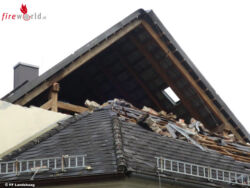 Das darunter liegende Dach wurde somit schwer beschädigt. Dadurch wurde der Dachstuhl mit Spanngurten gesichert. Aufgrund der Gefahr von herabfallenden Dachziegel wurde rund um das Gebäude eine Sperre eingerichtet.