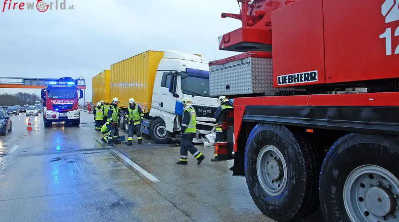 GUNTRAMSDORF (NÖ): Am 30. März 2015 kam es am Morgen zu einem Verkehrsunfall auf der A2 Fahrtrichtung Wien bei Guntramsdorf. Aus ungeklärter Ursache touchierte ein Lkw-Zug die rechte Leitplanke, querte dann alle vier Fahrspuren, rammte einen Pkw und kam dann an der Betonleitschiene zum Stehen.