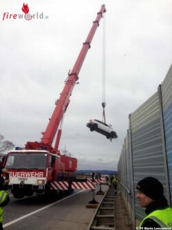 Zeitgleich wurden die zwei anderen nicht beschädigten Fahrzeuge durch die Feuerwehr Achau aus dem Straßengraben geborgen. Es wurde eine schwimmende Ölsperre flussabwärts nach dem Fahrzeug mittels Schwimmkörper im Wasser hergestellt, um bei der nachfolgenden Bergung mögliche, auslaufende Betriebsmittel auffangen zu können. Für die Bergung des Fahrzeuges wurde die Feuerwehr Mödling mit dem Kranfahrzeug des NÖLFV (LIEBHERR LTM 1070) nachalarmiert.