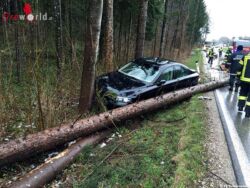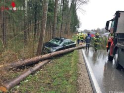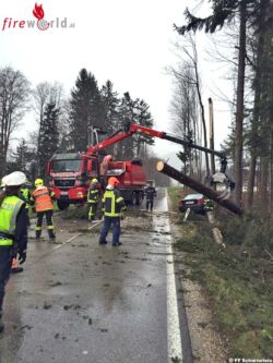 Wie sich jedoch bei Ankunft am Einsatzort herausstellte war auch ein Pkw beteiligt. Eine Fahrzeuglenkerin hatte großes Glück und konnte zwei umfallenden Bäumen gerade noch rechtzeitig ausweichen und kam im Straßengraben zum Stillstand. Am Fahrzeug selber entstand erheblicher Sachschaden.