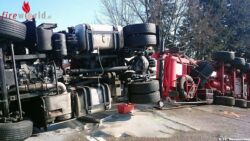 Zwei Schwerfahrzeuge waren zusammengeprallt wobei ein Lkw umstürzte. Die Einsatzmannschaft rückte mit dem Ölfahrzeug zur Unfallstelle aus und war mit Binden und Auffangen von Flüssigkeiten bis kurz vor 16.30 Uhr beschäftigt.