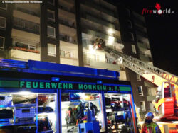 MONHEIM (DEUTSCHLAND): Kurz nach null Uhr des 3. April 2015 wurde der Monheimer Feuerwehr ein Wohnungsbrand in der Anne-Frank-Straße 21 gemeldet. Bei Eintreffen des ersten Löschzuges drang bereits dichter Brandrauch aus mehreren Geschossen des achtstöckigen Mehrfamilienhauses. Mehrere Personen standen auf Balkonen und Fenstern auf beiden Gebäudeseiten und machten auf sich aufmerksam bzw. riefen um Hilfe.