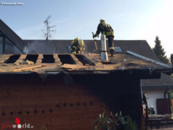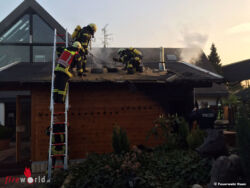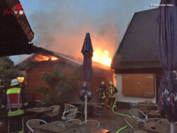 Währenddessen konnte auch die Brandbekämpfung an dem brennenden Saunahaus aufgenommen werden. Die Flammen hatten sich unterhalb des Daches auf der gesamten Länge ausgebreitet. Im Zuge der Löschmaßnahmen musste das Dach großflächig geöffnet werden, um an weitere Brandnester gelangen und diese löschen zu können.