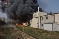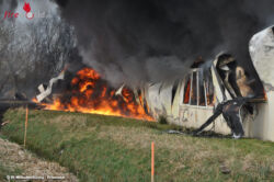 Nach jetzigem Ermittlungsstand waren in der Halle Naturöle und -farben, eine große Menge Kartonagen, Testbenzin und ein kleiner Heiztank gelagert, wobei dieser frühzeitig explodiert ist. Das Ausmaß des Brandschadens kann derzeit nicht eingeschätzt werden, verletzt wurde niemand!