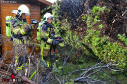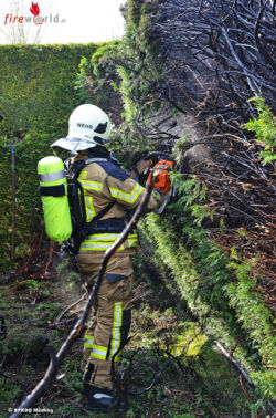 Durch die raschen und gezielten Löschmaßnahmen konnte ein Übergreifen auf die bereits durch die abstrahlende Hitze des Feuers rauchende Gartenhütte glücklicherweise verhindert werden. Um einen effektiven Löscherfolg zu erzielen, mussten die Einsatzkräfte mittels einer Motorkettensäge die verbrannte Gartenhecke ausschneiden, um auch die kleinsten Glutnester ablöschen zu können. Mit zwei Wärmebildkameras wurde der komplette Heckenbereich als auch die Gartenhütte auf Glutnester untersucht.
