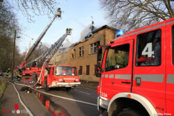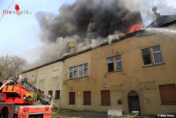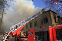 Die ersten Trupps konnten zur Brandbekämpfung im Innenangriff in das Gebäude eindringen, mussten allerdings nach kurzer Zeit wegen intensiver Wärmeentwicklung und Einsturzgefahr den Rückzug antreten. Das Feuer entwickelte sich an der rechten Ecke des Gebäudes in die hölzerne Dachkonstruktion und zog nach links. Dabei kam es immer wieder zu Durchzündungen der Dachhaut mit intensiver Rauchentwicklung. Mit insgesamt 70 Einsatzkräften von Berufs- und Freiwilliger Feuerwehr läuft der Einsatz seit nunmehr (Stand 20.00 Uhr) vier Stunden, das Dach ist weitestgehend zerstört.
