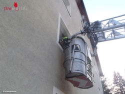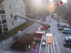 Ebenso wurde der Überdruckbelüfter vor der Haupteingangstüre aufgestellt, damit eine Bereichsbelüftung im Treppenhaus und Gang durchgeführt werden konnte. Mit der Drehleiter Reichenau wurden die 3 eingeschlossenen Personen mit Hilfe des Atemschutztrupps aus der Brandwohnung gerettet. Parallel zu diesen Arbeiten wurde von der Gruppe des Löschfahrzeuges eine Wasserversorgung aufgebaut sowie 2 C-Rohre für die Brandbekämpfung des Balkons samt Dachvorsprung vorgenommen.