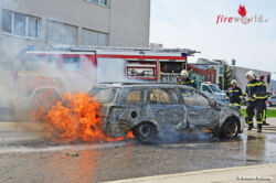 Zahlreiche Personen der angrenzenden Firmen bemerkten diesen Vorfall und verständigten sofort die Feuerwehr. Beim Eintreffen der Feuerwehr Brunn am Gebirge stand der Opel bereits im Vollbrand. Ein Atemschutztrupp begann sofort mit einem Rohr den Brand zu bekämpfen. Parallel dazu wurde aufgrund der hohen Brandintensität ein Mittelschaumrohr in Stellung gebracht. Durch den gleichzeitigen Einsatz beider Rohre konnte der Brand unter Kontrolle gebracht werden.