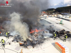 Die starke Rauchentwicklung sowie mehrere Gasflaschen und berstende PU-Schaumdosen erschwerten die Löscharbeiten. Um ca. 17h konnte "Brand Aus" gegeben werden. Der Großteil der eingesetzten 150 Feuerwehrkräfte aus 10 Feuerwehren konnte abrücken. Eine Brandwache verblieb vor Ort.