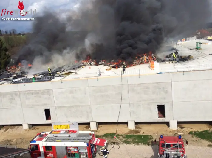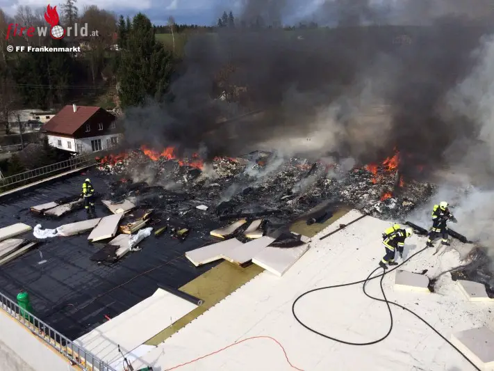 FRANKENMARKT (OÖ): Am 13.04.2015 wurde die FF Frankenmarkt um 15:38 Uhr gemeinsam mit der FF Raspoldsedt zu einem Brand auf eine Baustelle beieiner Firma alarmiert. Bei Flämmarbeiten auf dem Dach entstand ein Brand, der sich durch den herrschenden Wind rasch ausbreitete.