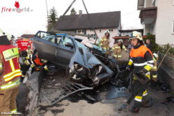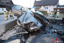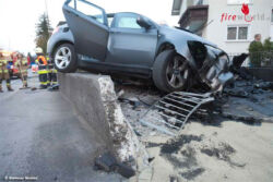 HOHENEMS (VBG): Gegen 06.15 Uhr krachte am 11. April 2015 ein Pkw-Lenker mit seinem BMW ungebremst und mit überhöhter Geschwindigkeit auf der Rudolf von Ems Straße in Hohenems gegen eine Gartenmauer. Der Mann aus dem Bezirk Feldkirch konnte noch vor dem Eintreffen der Feuerwehr aus dem Wrack klettern.