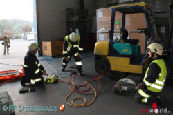 Übungsannahme war ein Brand im Lager der ortsansässigen Firma Bauer Baustoffe. Dabei wurden zwei Personen vermisst. Ebenso ist eine weitere Person beim Rangieren mit dem Gabelstapler unter diesen gekommen.