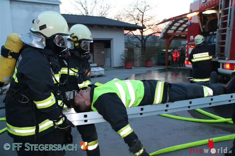 Nach dem Eintreffen der Fahrzeuge wurde sofort mittels Atemschutz die Personenrettung durchgeführt. Das Rüstfahrzeug begab sich auf die Hinterseite des Gebäudes um den verletzten Gabelstaplerfahrer zu retten. Gleichzeitig wurde ein umfangreicher Außenangriff durchgeführt und eine Zubringleitung vom Hydrant bzw. nahegelegenem Mühlbach hergestellt. Als unerwartete Übungseinlage wurde beim Löschangriff durch den Atemschutztrupp ein Helm eines Feuerwehrmannes gefunden. Der Trupp führte umgehend eine Personensuche durch und fand kurze Zeit später einen verletzen Feuerwehrmann hinter Regalen. Es musste improvisiert werden und die Person wurde mittels einer aufgefunden Leiter ins Freie gebracht.