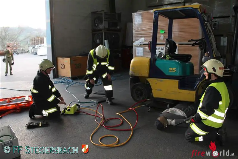 Übungsannahme war ein Brand im Lager der ortsansässigen Firma Bauer Baustoffe. Dabei wurden zwei Personen vermisst. Ebenso ist eine weitere Person beim Rangieren mit dem Gabelstapler unter diesen gekommen.