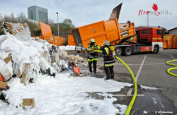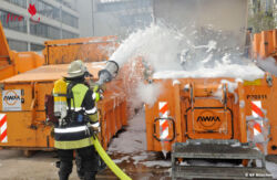 Der Versuch zeigte jedoch nur wenig Erfolg, aber dieKollegen hatten zwischenzeitlich den Hof geräumt und die Feuerwehr alarmiert. Bei deren Eintreffen stand der 20 m³ fassende Container bereits in Vollbrand. Miteinem Schaumrohr konnte man die Flammen jedoch schnell ersticken. Anschließend zogen die Einsatzkräfte den Presscontainer mit einem Wechselladerfahrzeug auf eine freie Fläche und kippten den Sperrmüll aus dem Behältnis. Dort wurden dann letzte Glutnester aufgespürt und mit viel Löschschaum bedeckt. Am Container entstand vermutlich ein wirtschaftlicher Totalschaden.