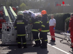 In der Fadingerstraße musste eine ältere Dame nach einem Sturz im 1. Stock ihres Wohnhauses erstversorgt und anschließend ins Krankenhaus gebracht werden. Aufgrund der Beschaffenheit des Stiegenhauses war ein Abtransport nur mit Hilfe der Drehleiter möglich. Die Patientin wurde am Balkon von den Rettungskräften übernommen, auf der Krankentragenaufnahme am Korb der Drehleiter gesichert und anschließend herunter gebracht.