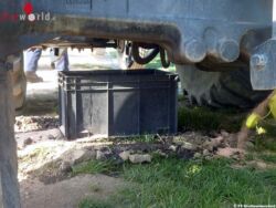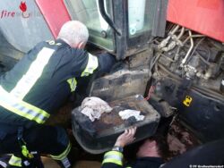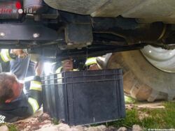 Diese traf gerade rechtzeitig ein, da der Behälter überzulaufen droht. Zuerst wurde der Behälter durch einen der Feuerwehr ersetzt und anschließend mittels Schadstoffpumpe der Diesel in ein großes Fass gepumpt. Als Ursache für den Austritt konnte ein Defekt an der Kabinenaufhängung festgestellt werden, weshalb die Verbindungsleitung zwischen linken und rechten Tank beschädigt wurde. Deshalb wurde der rechte Tank entfernt und die Verbindungleitung abgedichtet. Nachdem keine Gefahr mehr für die Umwelt bestand und die Reparatur durch eine Fachfirma erfolgt, konnte wieder eingerückt werden.