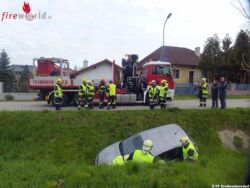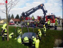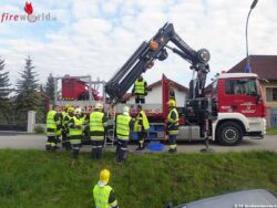 GROSSWEIKERSDORF (NÖ): Am 19. April 2015, um 7.34 Uhr, wurde die Freiwillige Feuerwehr Großweikersdorf von Florian Niederösterreich mittels Personenrufempfänger und Blaulicht-SMS mit dem Alarmtext „Technischer Einsatz. Pkw im Bach, in Großweikersdorf, Neubaugasse“ alarmiert.