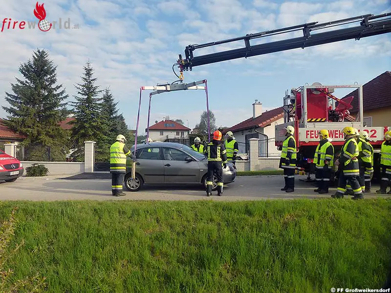 GROSSWEIKERSDORF (NÖ): Am 19. April 2015, um 7.34 Uhr, wurde die Freiwillige Feuerwehr Großweikersdorf von Florian Niederösterreich mittels Personenrufempfänger und Blaulicht-SMS mit dem Alarmtext „Technischer Einsatz. Pkw im Bach, in Großweikersdorf, Neubaugasse“ alarmiert.