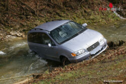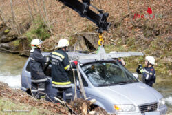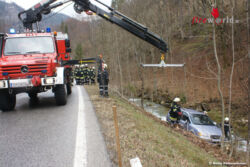 Somit hieß es, das Fahrzeug so schonend wie möglich aus dem Bach zu bergen, wozu das VF-A Unimog "Kran Hohenberg" nachalarmiert wurde. Werend der Bergung wurde der Verkehr einspurig an der Unfallstelle vorbeigeleitet.
