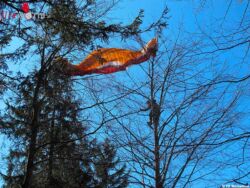 Er landete unweit der Startstelle auf einer hohen Buche und blieb zum Glück unverletzt. Er saß auf ca. 20m Höhe fest. Die Kameraden der Feuerwehr Altpernstein beobachteten den Absturz und starteten die Hilfskette.