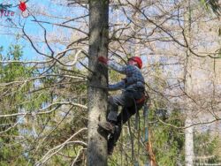 Zur Bergung des Schirms wurde dann die Drehleiter eingesetzt (der Baum war direkt neben einer Forststraße) und ein zweiter Baumkletterer. So konnte mit vereinten Kräften der Schirm aus den Wipfeln von zwei Bäumen "herausoperiert" werden. Dies war mit den vielen kleine Ästen sehr zeitraubend.