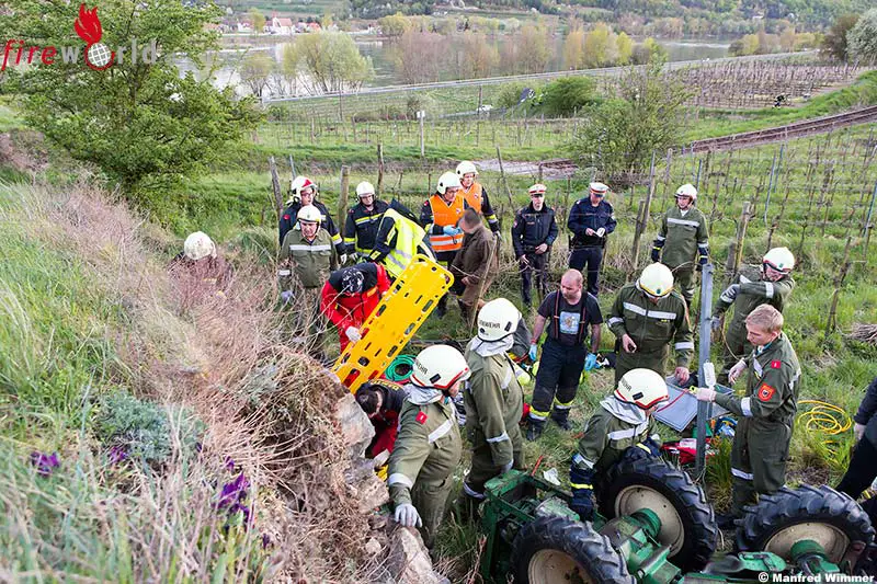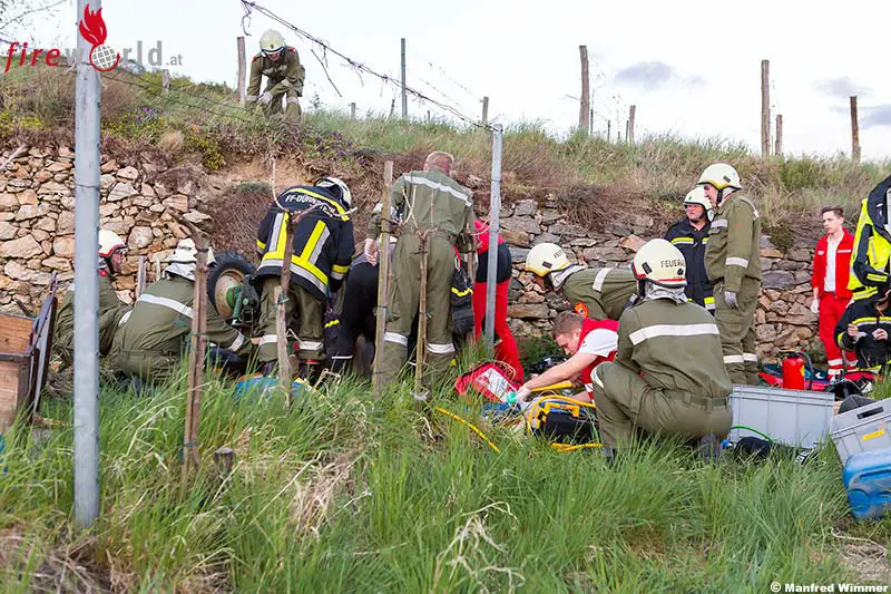DÜRNSTEIN (NÖ): In den Abendstunden des 20. April 2015 überschlug sich in den Weingärten bei Rothenhof (Gemeinde Dürnstein) ein Lenker mit seinem Traktor und wurde unter dem Fahrzeug eingeklemmt.