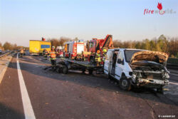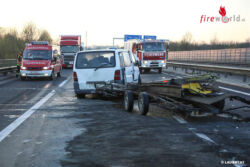 Ein 37-jähriger Kraftfahrer aus Belgien lenkte seinen Kleinbus mit Anhänger auf der Welser Autobahn im Bereich der Auffahrt Weißkirchen an der Traun in Richtung Passau. Aufgrund eines Reifenschadens kam das Fahrzeug gegen 04:50 Uhr ins Schleudern. Der 37-Jährige wollte das Fahrzeug auf den rechten Fahrstreifen lenken. Hinter dem Fahrzeug fuhr ein 60-jähriger Kraftfahrer aus Bulgarien. Dieser wollte nach links ausweichen, konnte den Lkw aber trotz Bremsmanövers nicht mehr rechtzeitig anhalten und kollidierte mit der Mittelleitschiene sowie dem Anhänger des 37-Jährigen.