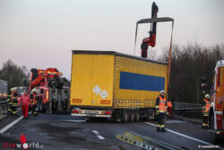 "Der Lkw kam quer zur Fahrbahn zum Stehen und stieß zum Teil durch das dortige Brückengeländer. Bei der Kollision sind aus den Tanks des Lkw etwa 500 Liter Dieseltreibstoff auf die Fahrbahn ausgelaufen," so die Polizei. Im Bereich der Autobahn standen drei Feuerwehren sowie ein Bergeunternehmen im Einsatz.