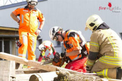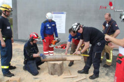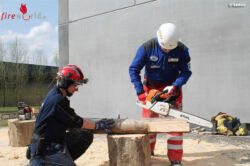 Am Nachmittag wurden Motorsägen sowie weiteres technisches Equipment in Betrieb genommen um die vier Praxisaufgaben (Bodenverankerungssysteme, das richtige Herstellen von passenden Holzkeilen, der Stirnversatz für Wandabstützungen sowie unterschiedliche Lastermittlungen) welche im Vorfeld durch das Organisationsteam vorbereitet wurden, abgearbeitet werden konnten.