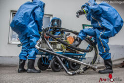 Inzwischen war auch die Freiw. Feuerwehr Wels mit dem Gefahrgut-Container eingetroffen. Das Begleitpersonal wies die örtlichen Kräfte – wie im Realfall auch – auf die benötigten Geräte ein. Die Arbeit selbst hat das vor Ort befindliche Personal durchzuführen. Ein erster Trupp nahm unter Vollschutz (also Schutzanzüge der Stufe III) die Abdichtung der leckgeschlagenen Behältnisse im Bereich des Eisenbahnwaggons vor. Ein zweiter Vollschutztrupp übernahm im Anschluss das Umpumpen der Säure in Ersatzbehältnisse.