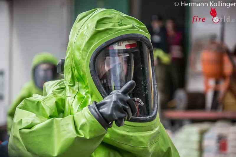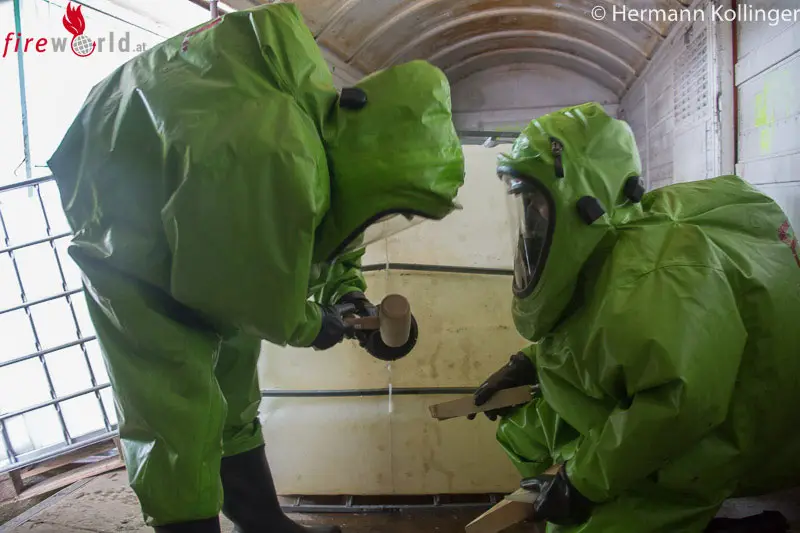 Inzwischen war auch die Freiw. Feuerwehr Wels mit dem Gefahrgut-Container eingetroffen. Das Begleitpersonal wies die örtlichen Kräfte – wie im Realfall auch – auf die benötigten Geräte ein. Die Arbeit selbst hat das vor Ort befindliche Personal durchzuführen. Ein erster Trupp nahm unter Vollschutz (also Schutzanzüge der Stufe III) die Abdichtung der leckgeschlagenen Behältnisse im Bereich des Eisenbahnwaggons vor. Ein zweiter Vollschutztrupp übernahm im Anschluss das Umpumpen der Säure in Ersatzbehältnisse.