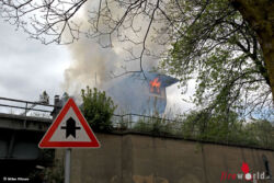 Sie forderten einen zweiten Löschzug nach. Das an der ehemaligen Rheinbahn gelegene, rechtwinklige Gebäude mit einer Schenkellänge von etwa 18 Metern wurde durch die Flammen erheblich beschädigt, der Dachstuhl ist größtenteils zerstört. Wegen der erhöhten Lage des Objektes auf dem Bahndamm kamen zwei Drehleitern mit Wasserwerfern zum Einsatz. Nachdem das Feuer unter Kontrolle war, konnten Atemschutztrupps in das Gebäude eindringen und nach Personen absuchen, sie wurden glücklicherweise nicht fündig.