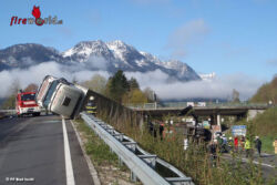 Ein Tiertransporter wollte auf die Abfahrt am Knoten Nord in Richtung Ebensee abfahren. Aus bisher unbekannter Ursache brach der Anhänger des Fahrzeuges in der Rechtskurve aus. In weiterer Folge stürzte der Anhänger über eine steile Böschung bzw. überschlug sich das Zugfahrzeug.