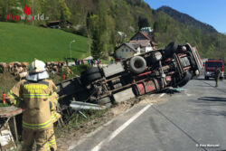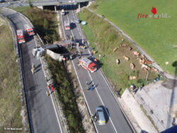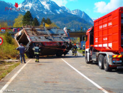 Ein entgegenkommender Lkw konnte rechtzeitig bremsen. Die nachkommenden Verkehrsteilnehmer veranlassten den Notruf. Der Lenker des Tiertransporters wurde nur leicht verletzt. Beim Eintreffen des ersten Einsatzfahrzeuges wurde auf Grund der Schadenslage, bzw. auf Grund der Tatsache dass sich der Einsatz zu einer Materialschlacht entwickeln würde, eine Nachalarmierung der gesamten FF Bad Ischl, der FF Mitterweißenbach sowie der FF Pfandl veranlasst. Ein Tierarzt war bereits am Einsatzort anwesend und versorgte die Tiere medizinisch.