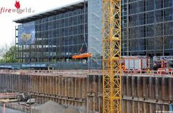 MÜNCHEN (D): Auf der Baustelle eines Bürogebäudes in unmittelbarer Nähe des alten Flughafentowers in München-Riem ist es am Morgen des 25. April 2015, zu einem Unfall mit einem schwerverletzten Arbeiter gekommen.