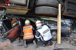 Nachdem alle Personen aus dem Bus gerettet worden sind, sicherte die BF Graz mit dem Kranfahrzeug den Bus und hob in leicht an, um Zugang zu den eingeklemmten Personen im Fahrzeug unterhalb zu schaffen. Diese wurden mittels hydraulischem Rettungsgerät aus dem Fahrzeug befreit und sofort ärztlich betreut. Trotz des raschen Einsatzes der Freiwilligen Feuerwehren des Abschnittes 08 – Lannach, konnte der Notarzt nur mehr den Tod der beiden feststellen.