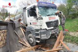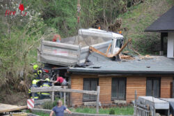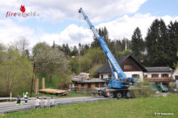 Kurz darauf rückten schon die ersten Fahrzeuge zum Einsatzort aus. Nach der Erkundung durch den Einsatzleiter konnte festgestellt werden, dass für die Bergung des Lkw ein Mobilkran benötigt wird. Unverzüglich wurde dieser über die Florianstation angefordert.