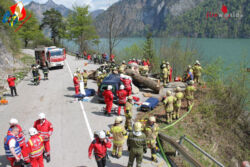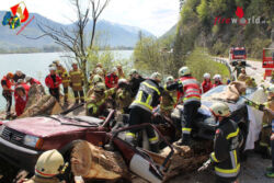 Umgehend rückten die Kameraden mit RLF-A 2000, TLF-A 2000 und A-Boot zum Übungsort aus, zeitgleich wurde beim Segelclub Ebensee der Einsatzstab eingerichtet. Am Übungsort eingetroffen wurde zusammen mit der FF-Traunkirchen sofort mit der Menschenrettung begonnen, ein 3-facher Brandschutz aufgebaut und aufgrund der Lage, nach kurzer Zeit die FF-Roith nachalarmiert. Mit Hilfe der Seilwinde der FF-Traunkirchen wurden große Steine und Wurzelstöcke zur Seite gezogen und die Baumstämme mit einer Motorsäge zerteilt und zur Seite gelegt, um einen Zugang zu den verunfallten Fahrzeugen zu schaffen.
